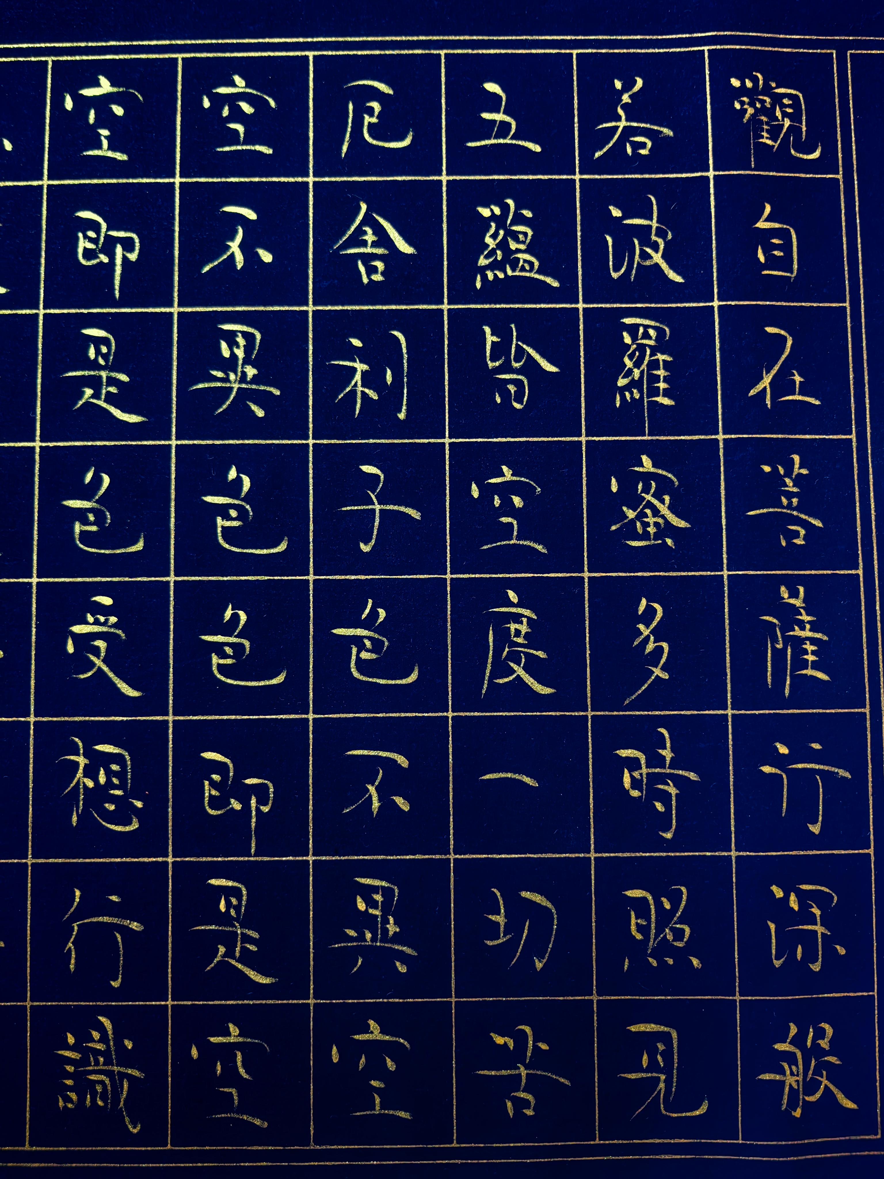 在北京一间充满文人气息的工作室内,胡家喜先生正悬腕运笔,深蓝方格笺上金墨流光。随着笔锋起落,《心经》经文如莲绽放,墨色凝香间禅意流淌——这幅作品,正是他独创“道虚体”书风的精妙呈现。